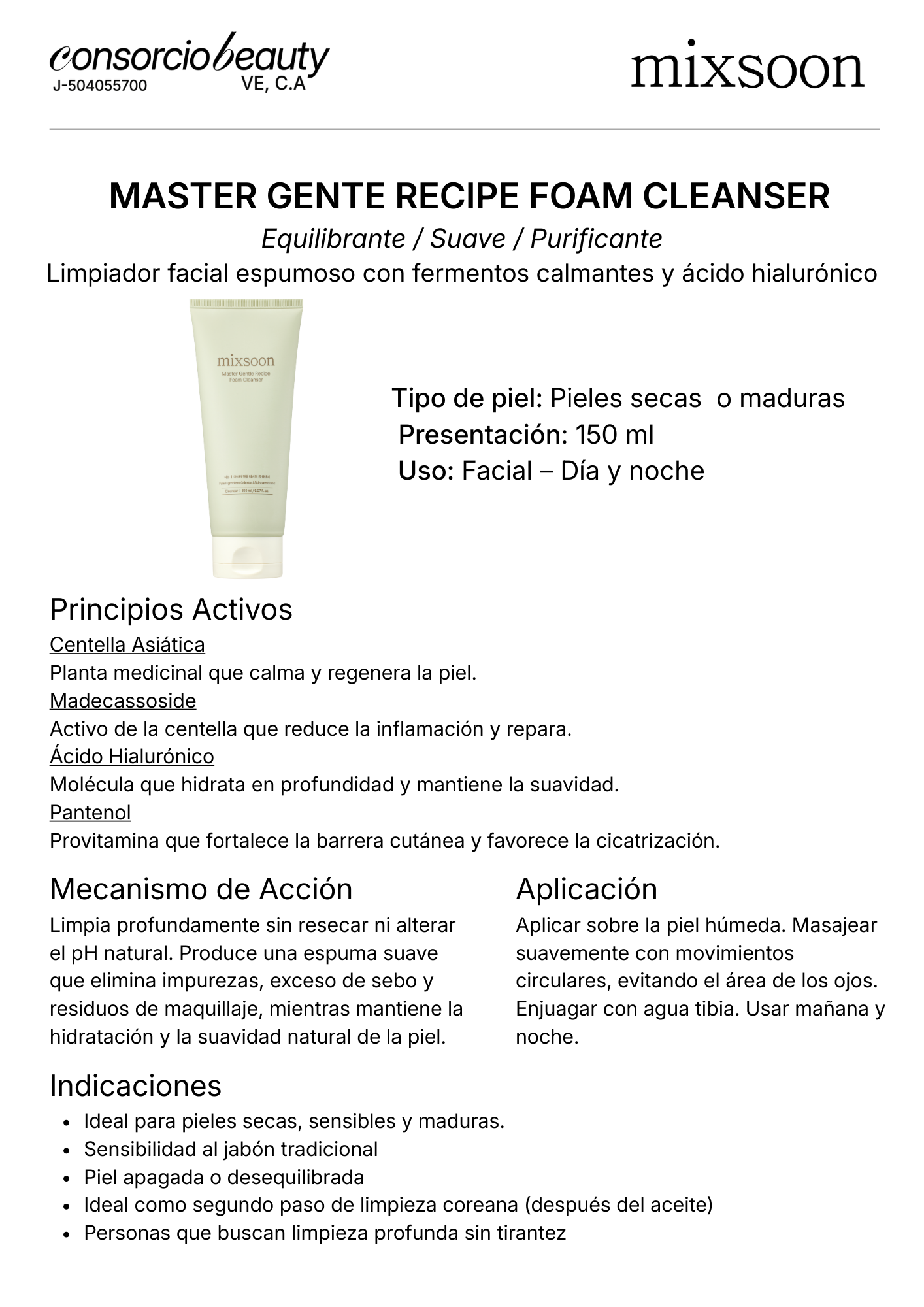 El Master Gentle Recipe Foam Cleanser es un limpiador facial en espuma diseñado para pieles secas, sensibles y mixtas. Su fórmula suave e hidratante mejora la textura de la piel mientras realiza una limpieza profunda sin causar irritación.