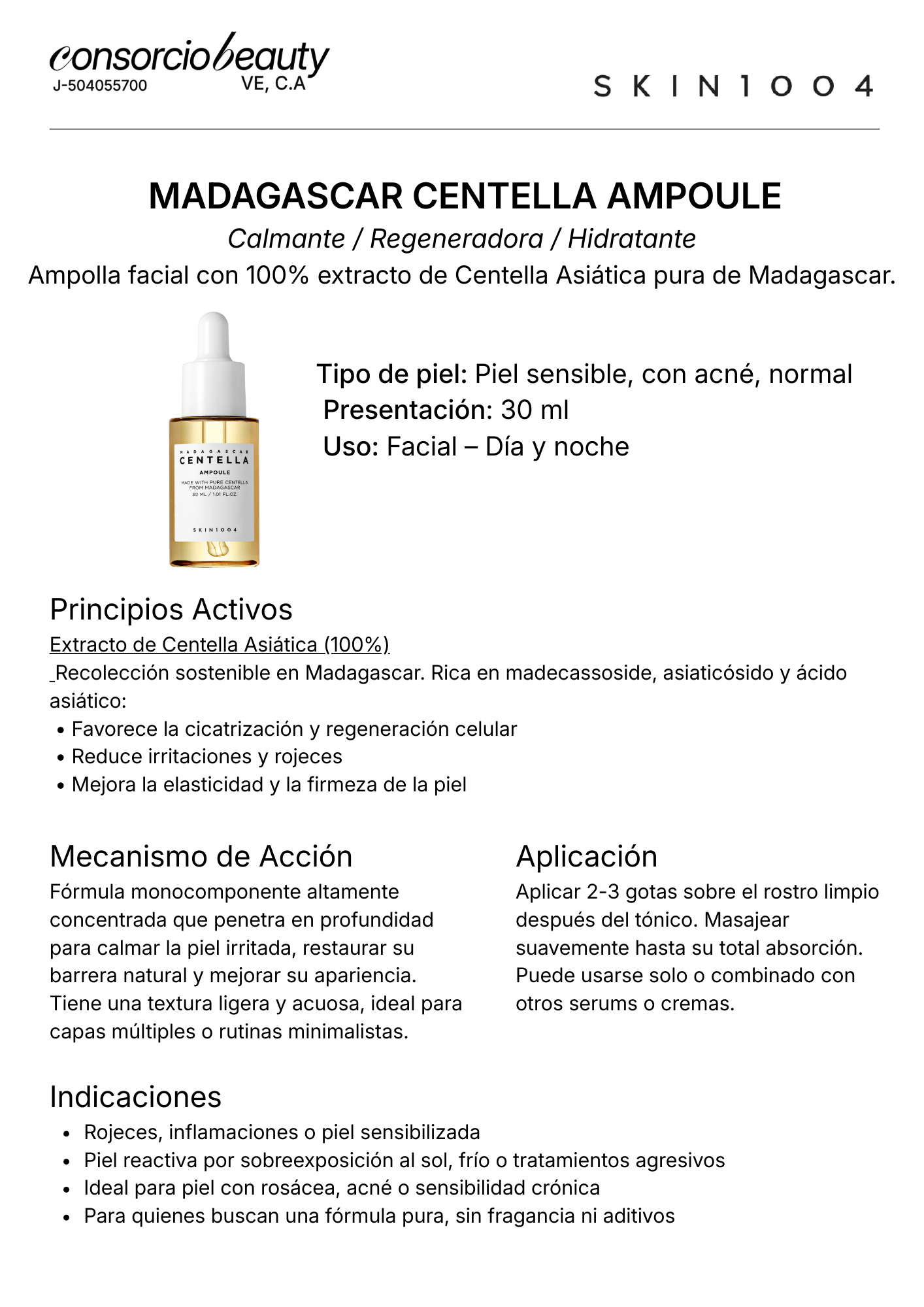La Madagascar Centella Ampoule es una ampolla altamente concentrada con un 100% de extracto de centella asiática, diseñada para calmar, regenerar y fortalecer la piel sensible o irritada. Es un tratamiento minimalista y eficaz para restaurar la barrera cutánea.