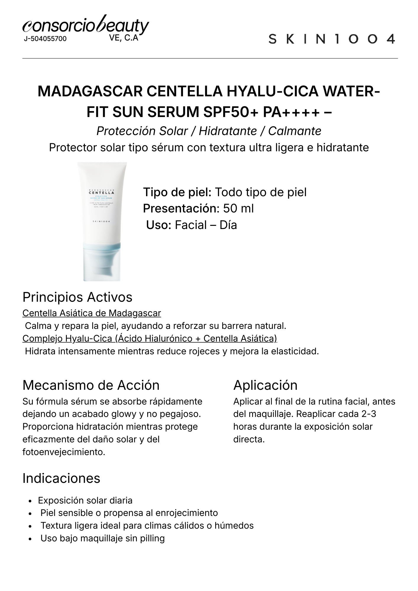 El Madagascar Centella Hyalu-Cica Water-Fit Sun Sérum es un protector solar híbrido (químico + físico) con textura ligera tipo sérum que hidrata, calma y protege la piel sin dejar rastro blanco ni sensación pegajosa. Ideal para el uso diario incluso en pieles sensibles.