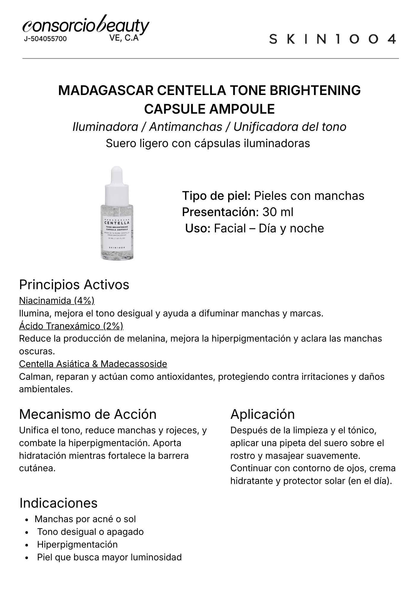 La Madagascar Centella Tone Brightening Capsule Ampoule es una ampolla iluminadora que combina cápsulas concentradas de niacinamida y centella asiática para tratar el tono desigual de la piel y restaurar su luminosidad natural.