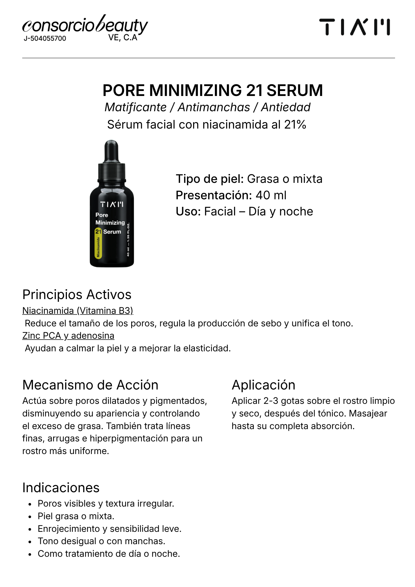 El Pore Minimizing 21 Sérum de Tiam es un sérum facial diseñado para minimizar visiblemente el tamaño de los poros y controlar la producción de sebo. Su fórmula vegana y libre de parabenos, gluten y fragancias, ayuda a mejorar la textura de la piel, reduciendo puntos negros, enrojecimiento, líneas finas e hiperpigmentación. Ideal para pieles grasas y propensas al acné.