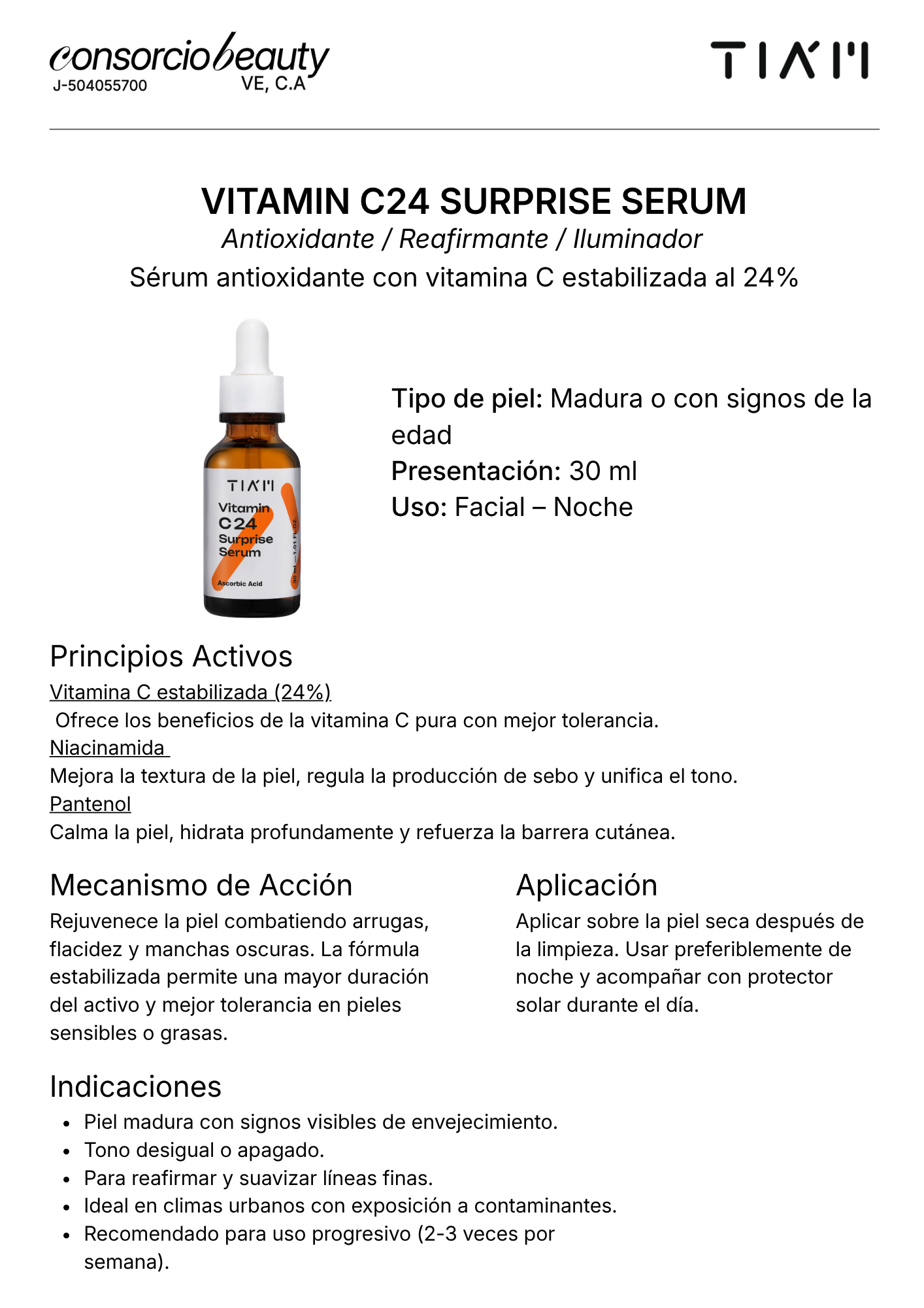 - Vitamina C (Ácido Ascórbico 24%): Potente antioxidante que ilumina la piel, reduce manchas y estimula la producción de colágeno.