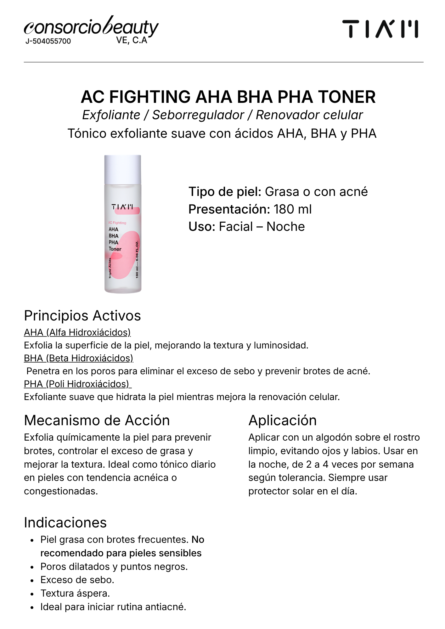 El AC Fighting AHA BHA PHA Toner de Tiam es un tónico exfoliante diseñado para pieles grasas con exceso de sebo. Su fórmula libre de alcohol y fragancias ayuda a remover suavemente las células muertas, unificando el color y la textura de la piel sin causar irritación. Ideal para combatir el acné, minimizar poros abiertos y controlar la producción de sebo.