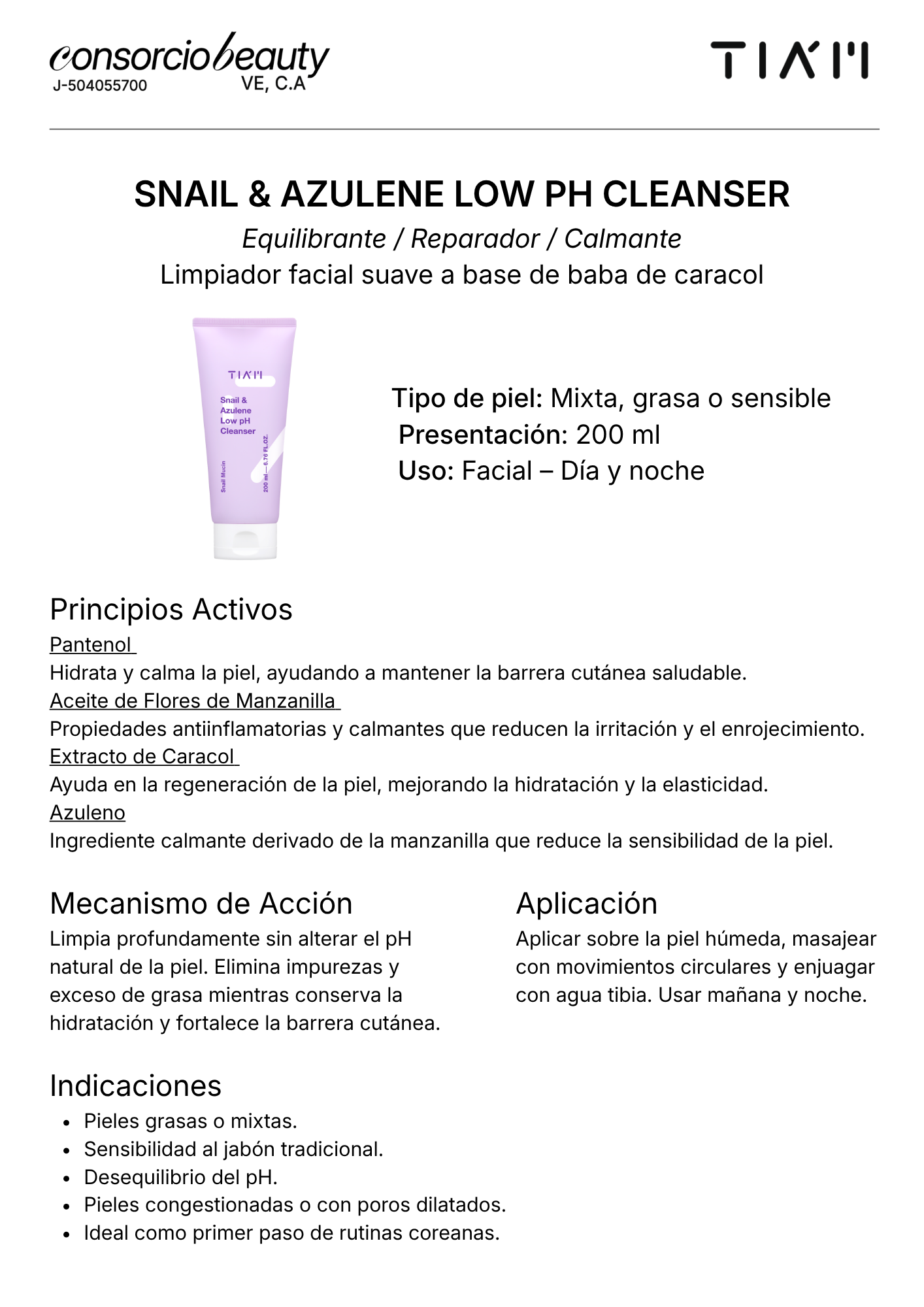 El Snail & Azulene Low pH Cleanser de Tiam es un limpiador facial en gel diseñado para mantener el equilibrio adecuado del pH de la piel, protegiendo su barrera natural de humedad. Ideal para pieles deshidratadas, dañadas y sensibles, este limpiador elimina eficazmente la suciedad, el exceso de sebo e impurezas sin causar irritación ni resequedad.